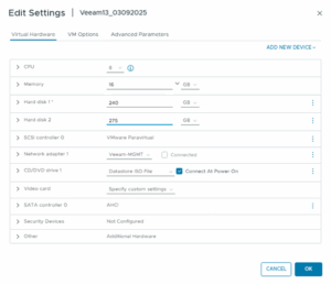 Pro instalaci z ISO requirments 8 CPU, 16 Memory, a dva disky minimálně 240GB. První pro OS a druhý pro data