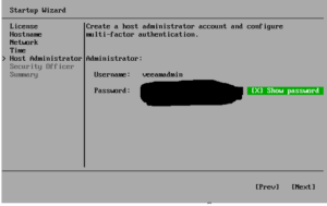 Instalační wizard je přímočarý a jednoduchý. Odsouhlasení licence, nastavení hostname, network, time, Admin heslo pro veeamadmin, security officer veeamso, MFA nezapomeňte ve Windows konzoli je potřeba ji zapnout ručně.