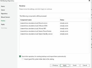 Zde záleží na situaci – rozhoduje velikost backup dat a možnosti dočasných uložišt. Já jsem žádna data přesouvat nechtěl, takže jsem si připojil nové VHR JEOS13 pod DNS názvem, zatím co původní jsem měl připojené přes ip adresu. Po připojení upgradlého VHR JEOS13 stačí naimportovat backupJoby a namapovat a znovu enablovat backupJoby a pak odstranit staré VHR 2.0 a jeho LinuxServer. Vše step by step s obrázky níže.