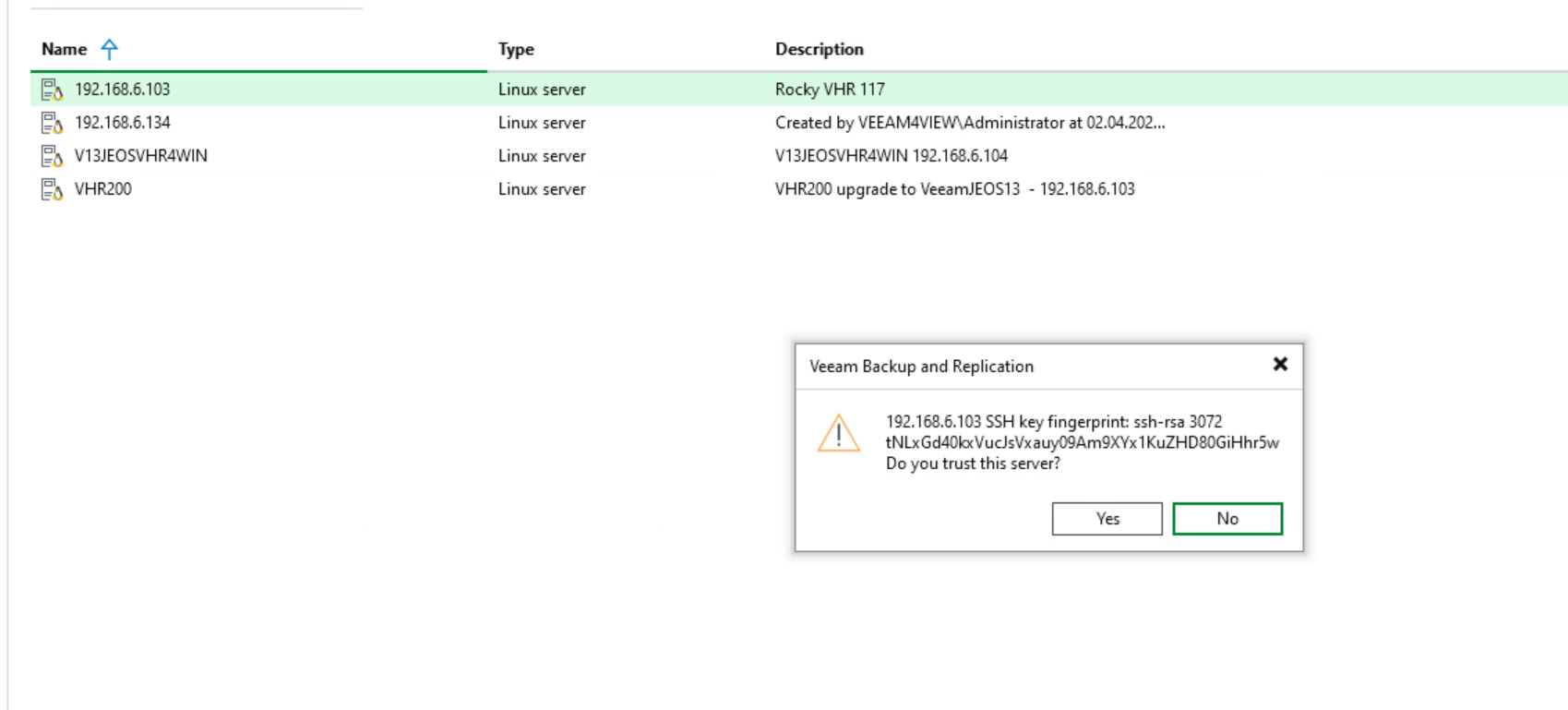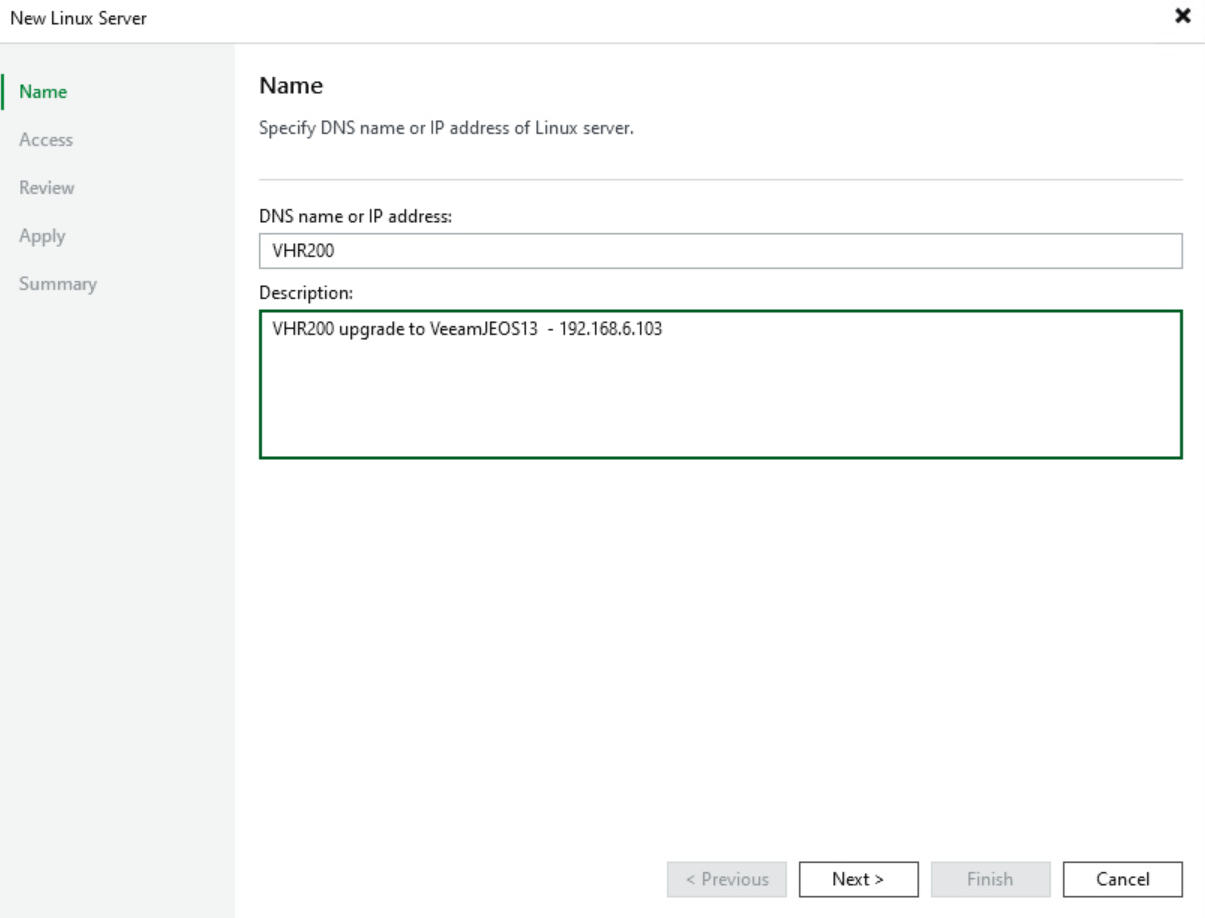 Tady se dostáveme do hádanky jak připojit VHR JEOS13 do VBR, máme několik možností nové FQDN a IP. Opak původního VHR tzn. DNS vs IP nebo IP vs DNS. Původní název bychom mohli zachovat, ale museli bychom nejdříve před přemapováním BackupJobů použít nějaké dočasné repository a pro mapovaní backupjobů bychom museli přesouvat backup soubory.