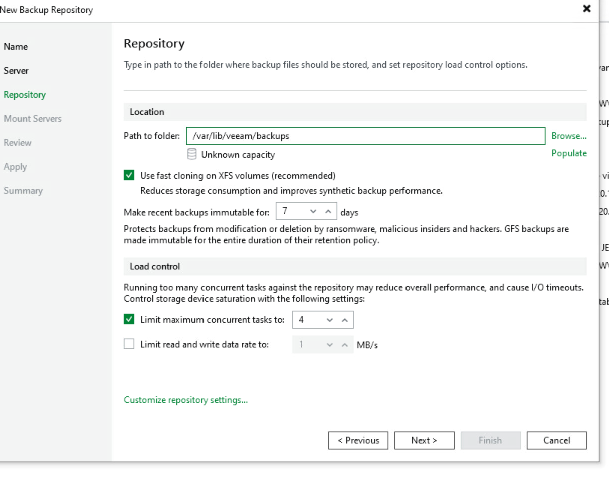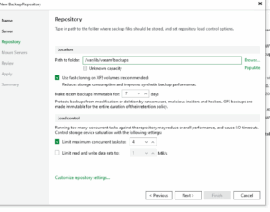 - S připojeným Linux Serverem již můžeme vytvořit nové Repository, nezapomeňte zaškrnout Search the repository for existing backups and import them automatically