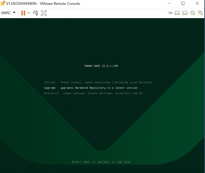 Samotný upgrade není složitý, připojit ISO, zvolit v instalaci Veeam Hardened Repository a pak upgrade. (možnost reinstall, se nabízí například pokud bychom ztratili přístupové údaje).